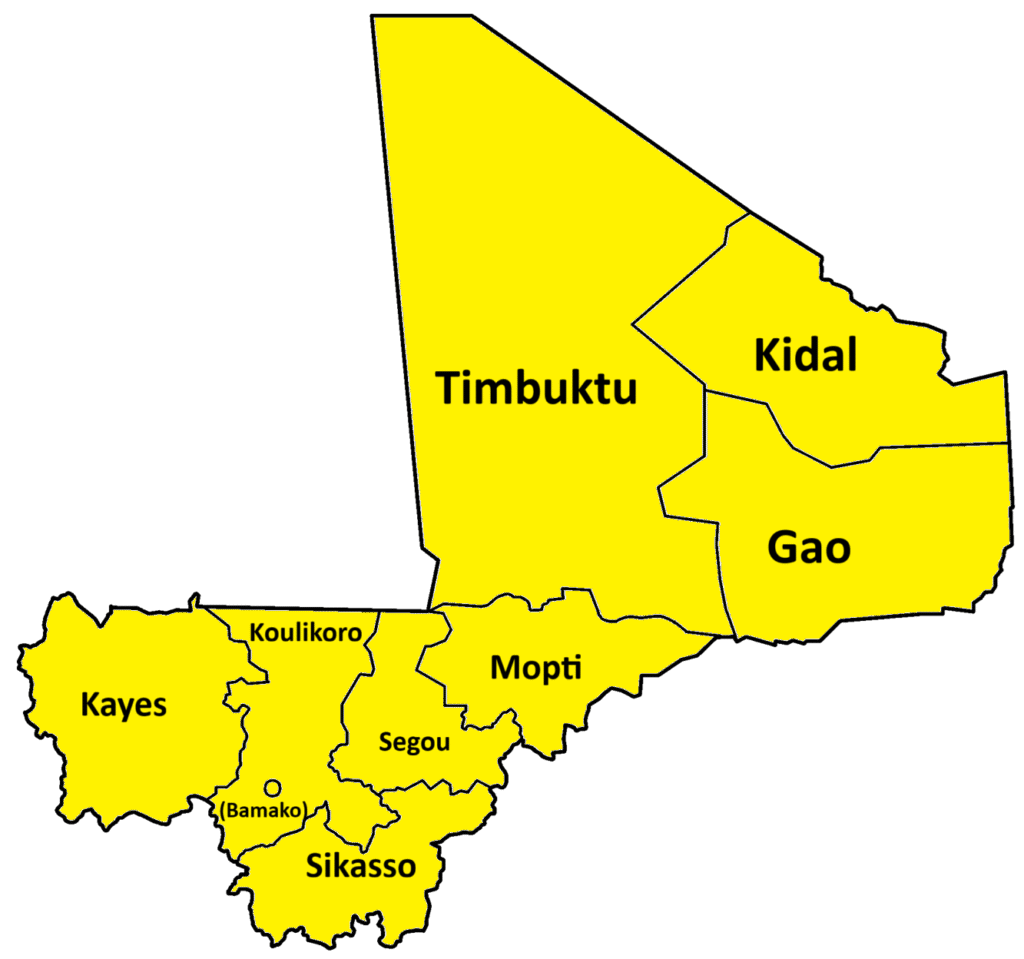 Map of the Malian regions. Every region is named after its regional capital. Timbuktu, Kidal and Gao together make up north Mali.