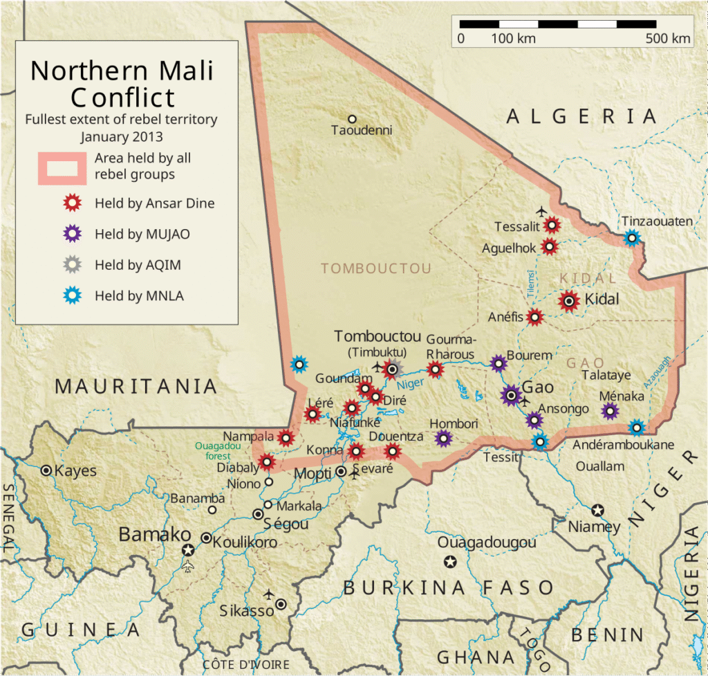 At the same time, fighters from the Al-Qaida in the Islamic Maghreb (AQIM) in Algeria were infiltrating Mali from the north, and would band together with local Islamist activists in Mali from the group “Defenders of the Faith” or Ansar Dine.[3] Ansar Dine had been active from before the Tuareg revolt in 2012, but the fall of the Malian army in the north Mali region allowed them to rise to prominence.