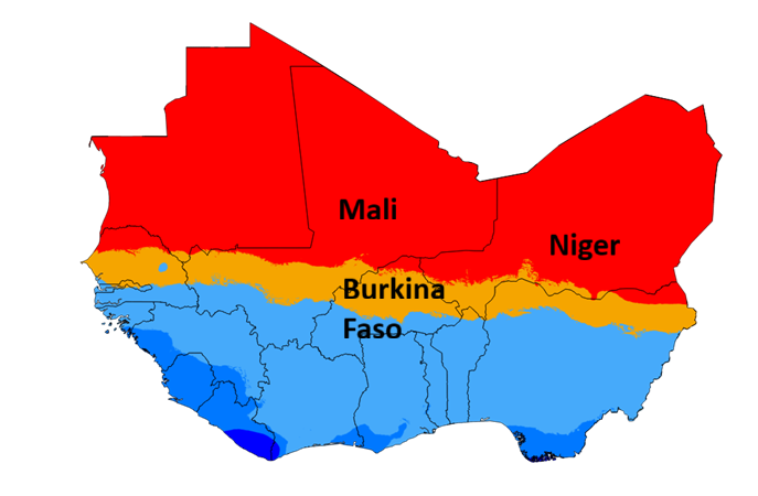 Climate zones of West Africa. Red is the Sahara, orange is the Sahel, and light blue is the savannah region known as the Sudan.