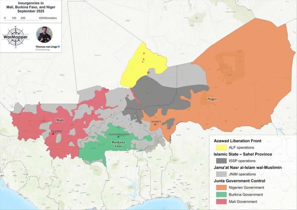 Freelance reporter Thomas Van Linge’s map of the Sahel war as of September 2025.