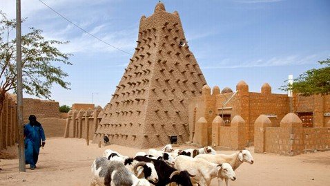 A peaceful scene in Timbuktu, where a shepherd herds his goats in front of the Sankore Madrasa.