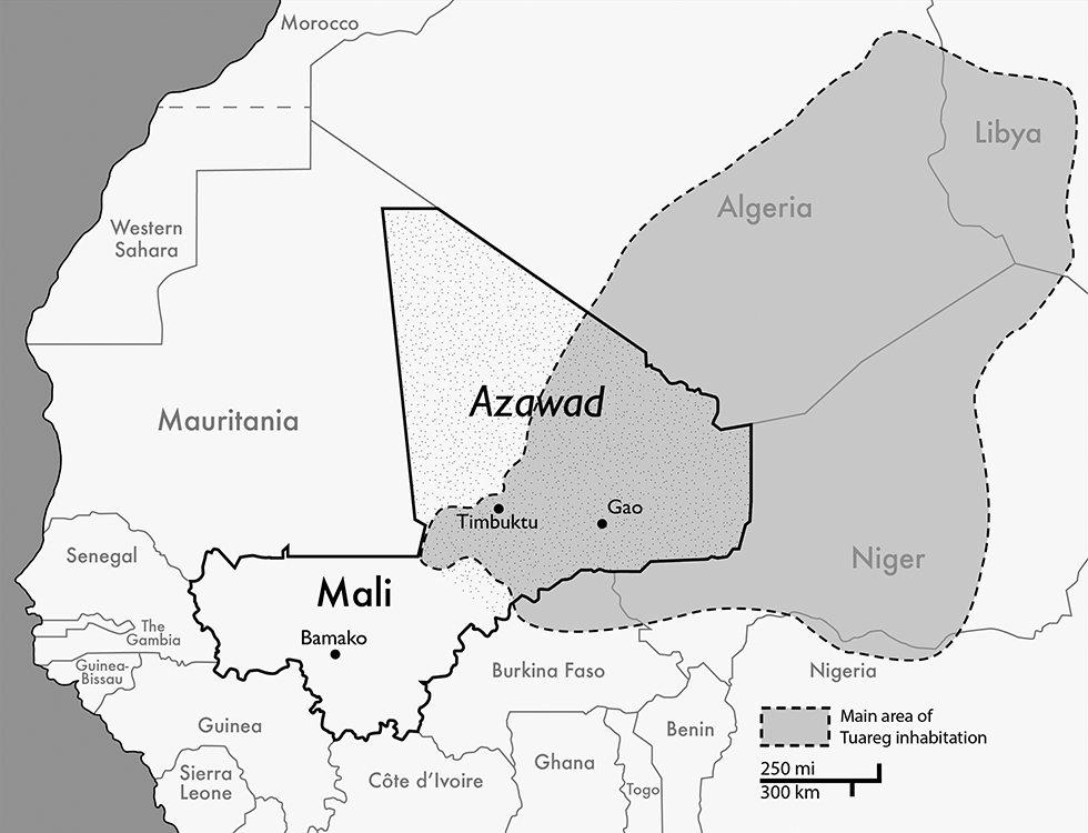 The war in Mali began with a dual spillover from wars to the country’s north. In 2011, Tuareg fighters returned to Mali from Libya, where many of them had fought for Ghaddafi’s dying regime as mercenaries.[1] These fighters, together with Tuareg veterans from an earlier revolt in 2007-2009, form the National Movement for the Liberation of Azawad (MNLA), with the goal of complete political independence from Mali.[2] The Tuaregs are the largest exclusively Saharan people, but they do not have a state of their own.