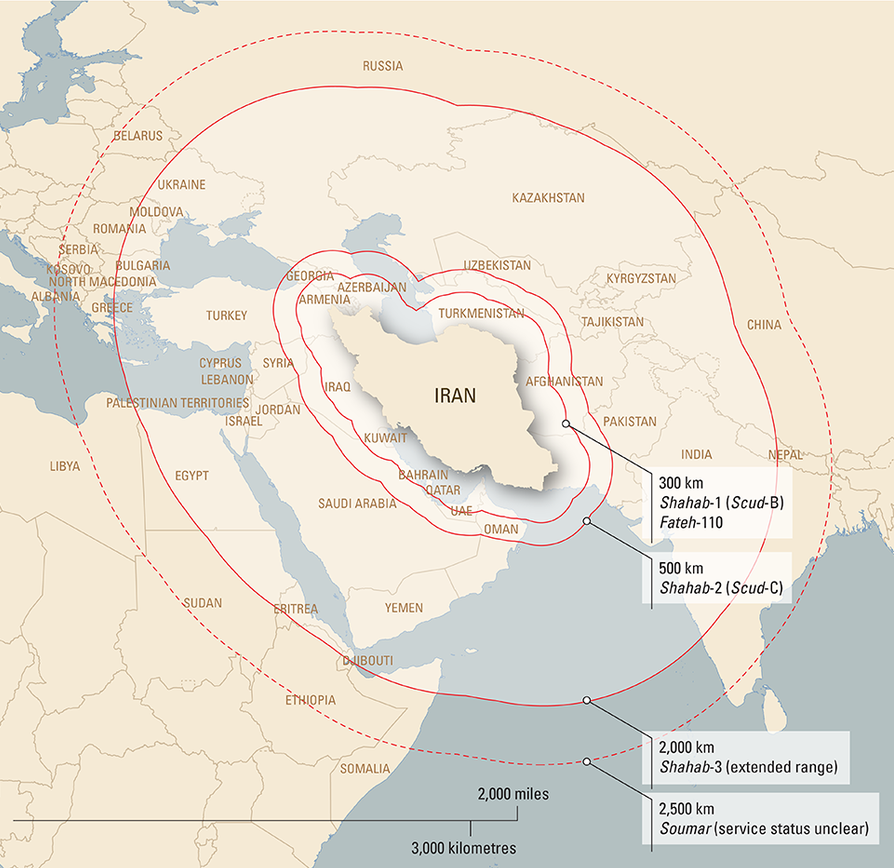 An IISS map showing the range of a few selected Iranian missile types. Iran has by far most short-ranged missiles, capable of hitting the Gulf States, but not much beyond.